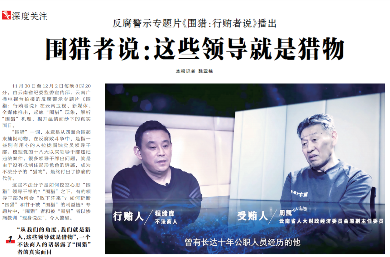 ●今天出版的中国纪检监察报深度关注专栏以《围猎者说:这些领导就是猎物》为题,聚焦反腐警示专题片《围猎:行贿者说》。文章指出:面对无所不用其极的“围猎”,领导干部要保持足够警惕。同时对巨额行贿、多次行贿的要严肃处置,坚决斩断“围猎”和甘于被“围猎”的利益链。