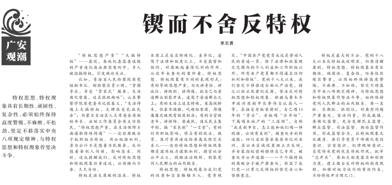 ●今天出版的中国纪检监察报广安观潮专栏发表评论《锲而不舍反特权》,关注近期通报的青海省人民检察院原副检察长贾小刚等多起严重违纪违法典型案例。文章指出:这些腐败分子把职权当特权、用公权换私利,身为公仆不是想着为民服务,反而想着要别人伺候,影响恶劣。
