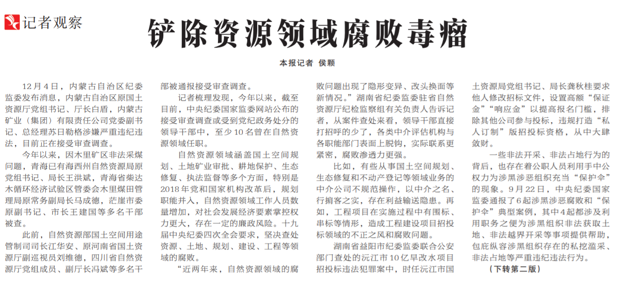 ●今年以来,中央纪委国家监委网站公布的接受审查调查或受到党纪政务处分的领导干部中,至少10名曾在自然资源领域任职。今天出版的中国纪检监察报头版以《铲除资源领域腐败毒瘤》为题报道指出:自然资源领域腐败既有各级主管部门“一把手”,也有基层执法监管人员,大额贪腐和雁过拔毛式小额腐败并存。从源头和根本上铲除腐败滋生的土壤,关键在于加强制度建设,强化廉政教育。