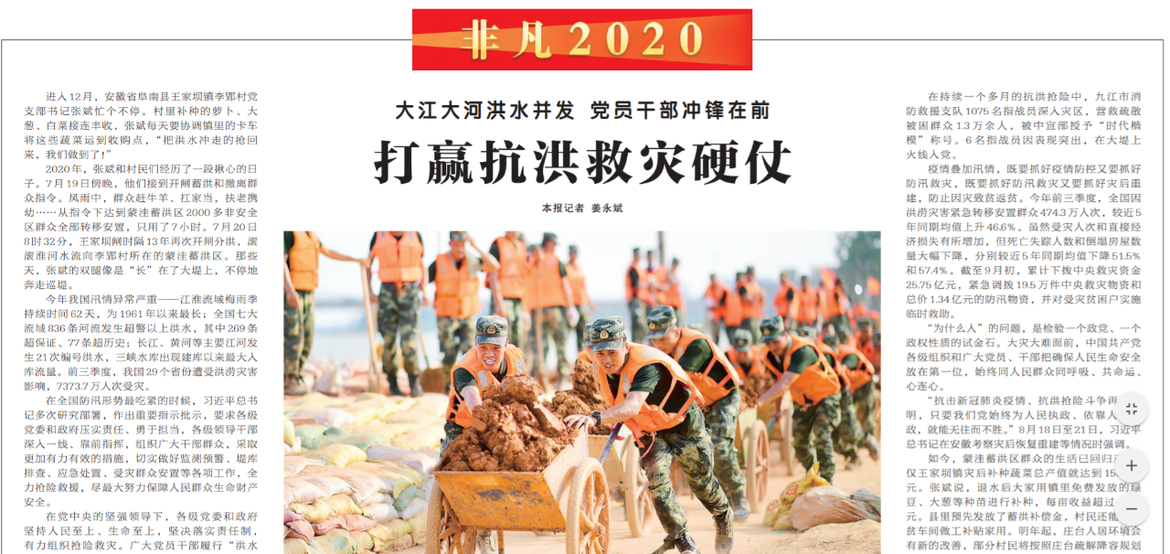 ●今天出版的中国纪检监察报头版非凡2020专栏回顾了今年汛情期间,安徽蒙洼蓄洪区等地党员干部冲锋在前,打赢抗洪救灾硬仗的情况。