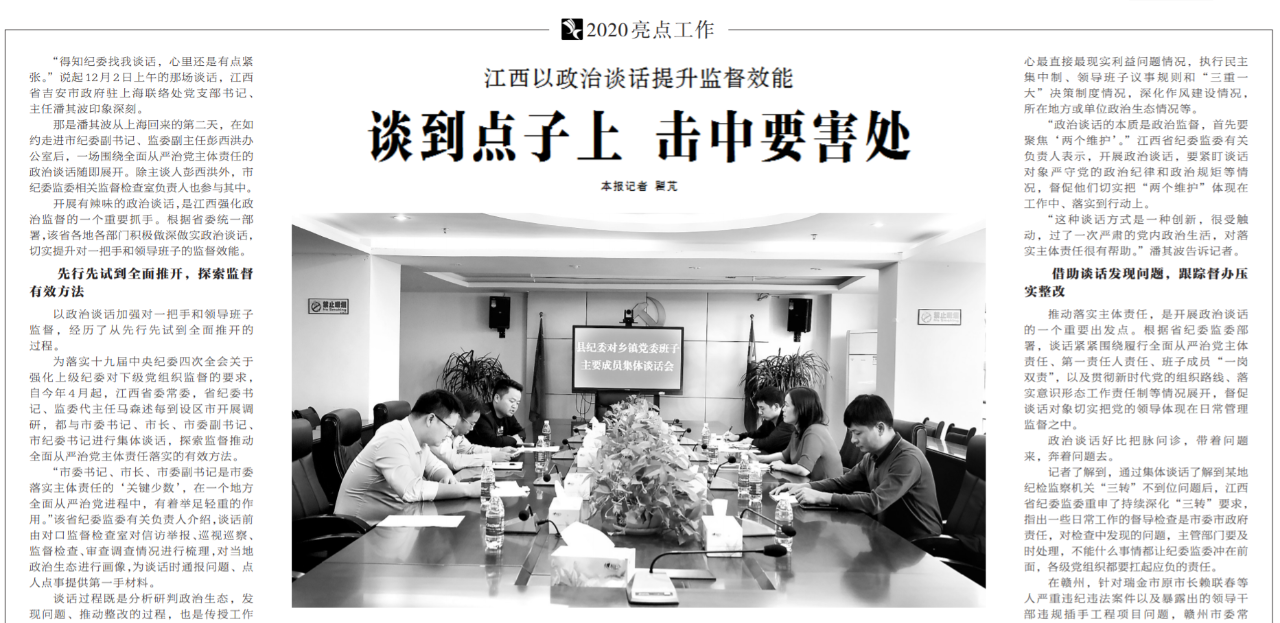 ●今天出版的中国纪检监察报2020亮点工作专栏报道了江西积极做深做实政治谈话,切实提升对一把手和领导班子的监督效能的相关举措。