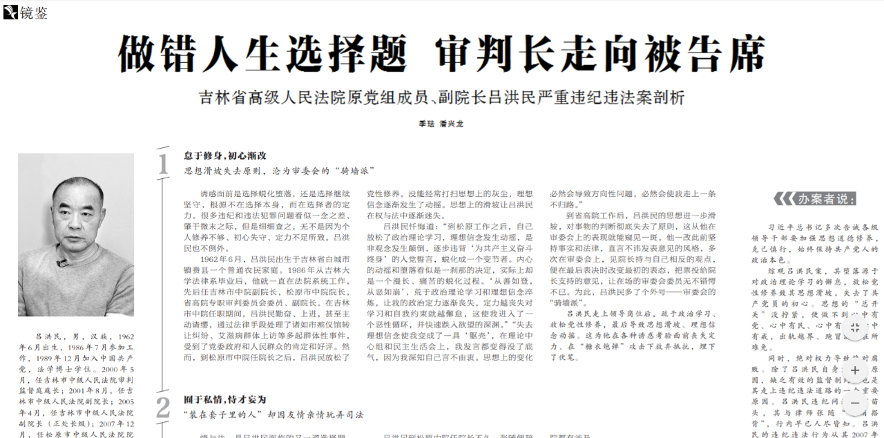 ●今天出版的中国纪检监察报以《做错人生选择题 审判长走向被告席》为题,剖析吉林省高级人民法院原副院长吕洪民严重违纪违法案。吕洪民在领导岗位上疏于政治学习、放松党性修养,因友情亲情玩弄司法,把以权谋财当作“第一要务”。