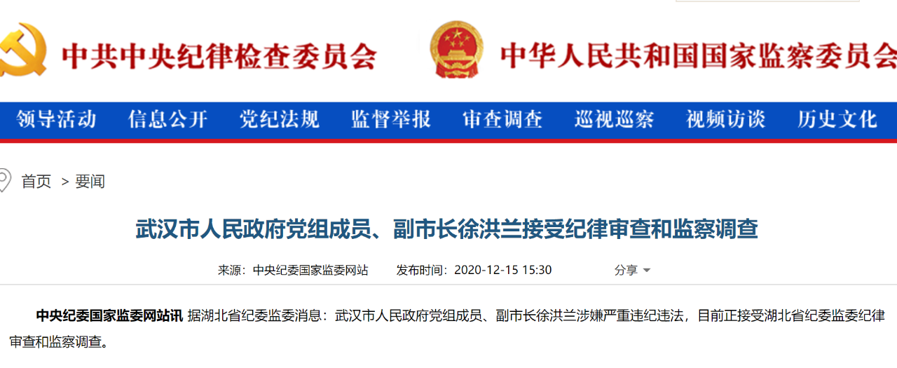 ●中央纪委国家监委网站15日发布通报:武汉市人民政府党组成员、副市长徐洪兰涉嫌严重违纪违法,目前正接受湖北省纪委监委纪律审查和监察调查。