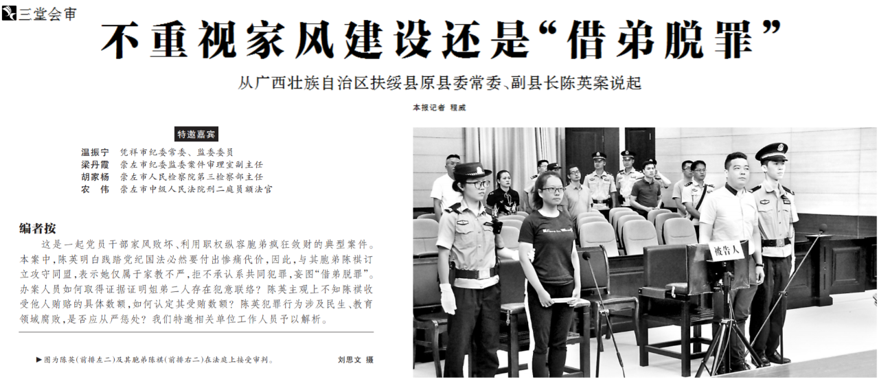 ●今天出版的中国纪检监察报三堂会审专栏以《不重视家风建设还是“借弟脱罪”》为题,聚焦分析广西壮族自治区扶绥县原县委常委、副县长陈英案。