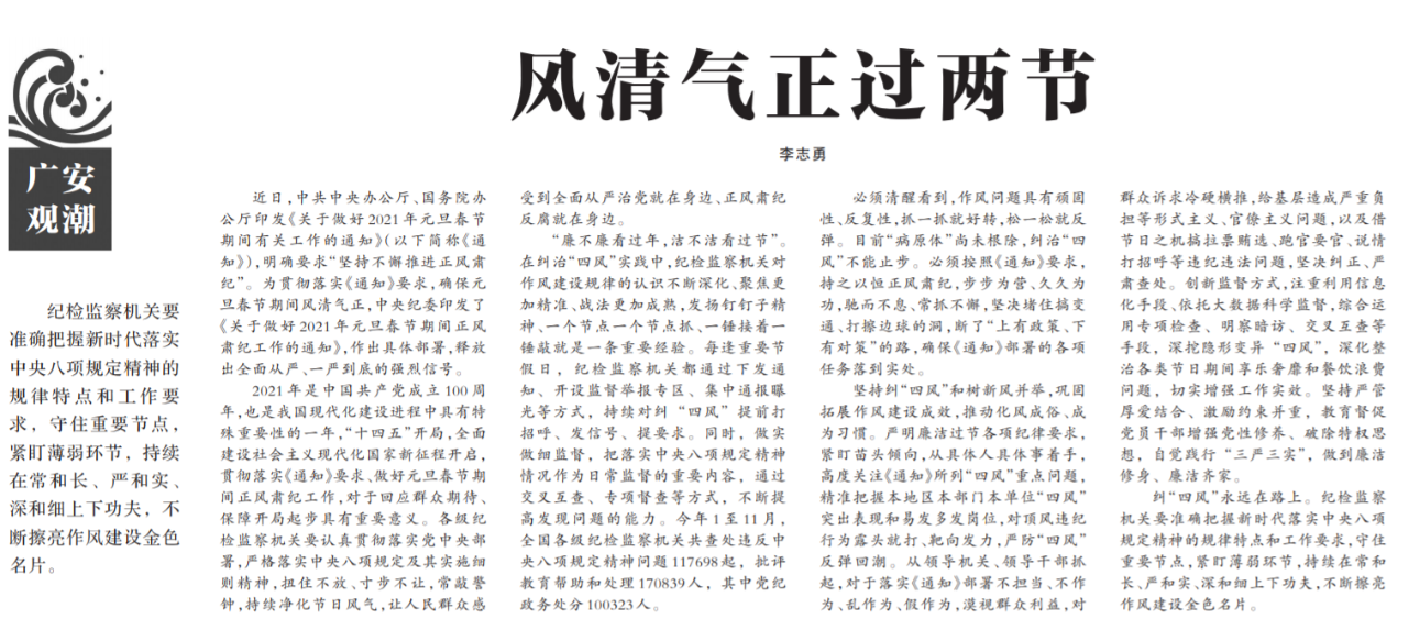 ●今天出版的中国纪检监察报广安观潮专栏发表评论《风清气正过两节》指出:各级纪检监察机关要认真贯彻落实党中央部署,严格落实中央八项规定及其实施细则精神,扭住不放、寸步不让,常敲警钟,持续净化节日风气。