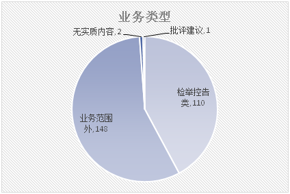从业务类型看,检举控告类110件次,占42%,业务范围外148件次,占57%,无实质内容2件次,批评建议1件次。
