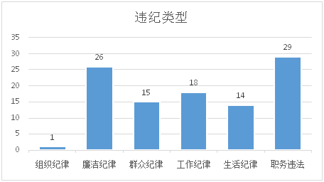 从违纪类型上看,违反组织纪律1起、廉洁纪律26起、群众纪律15起,工作纪律18起,生活纪律14起,职务违法犯罪29起。(芜湖市纪委监委)