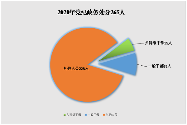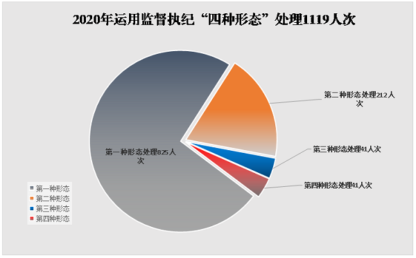 2020年,全县纪检监察机关运用监督执纪“四种形态”批评教育帮助和处理1119人次。其中,运用第一种形态批评教育帮助825人次,占总人次的73.7%;运用第二种形态处理212人次,占18.9%;运用第三种形态处理41人次,占3.7%;运用第四种形态处理41人次,占3.7%。
