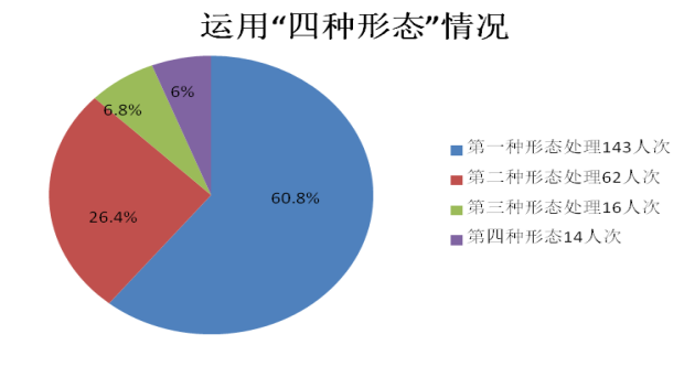 2020年全区纪检监察机关准确运用监督执纪“四种形态”处理235人次。其中,第一种形态143人次,占60.8%;第二种形态62人次,占26.4%;第三种形态16人次,占6.8%;第四种形态14人次,占6%。(芜湖市纪委监委)