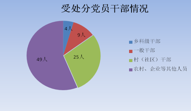 从受处分人员类别来看,处分科级干部4人,一般干部9人,村(居)干部25人,企业、农村普通党员等其他人员49人。