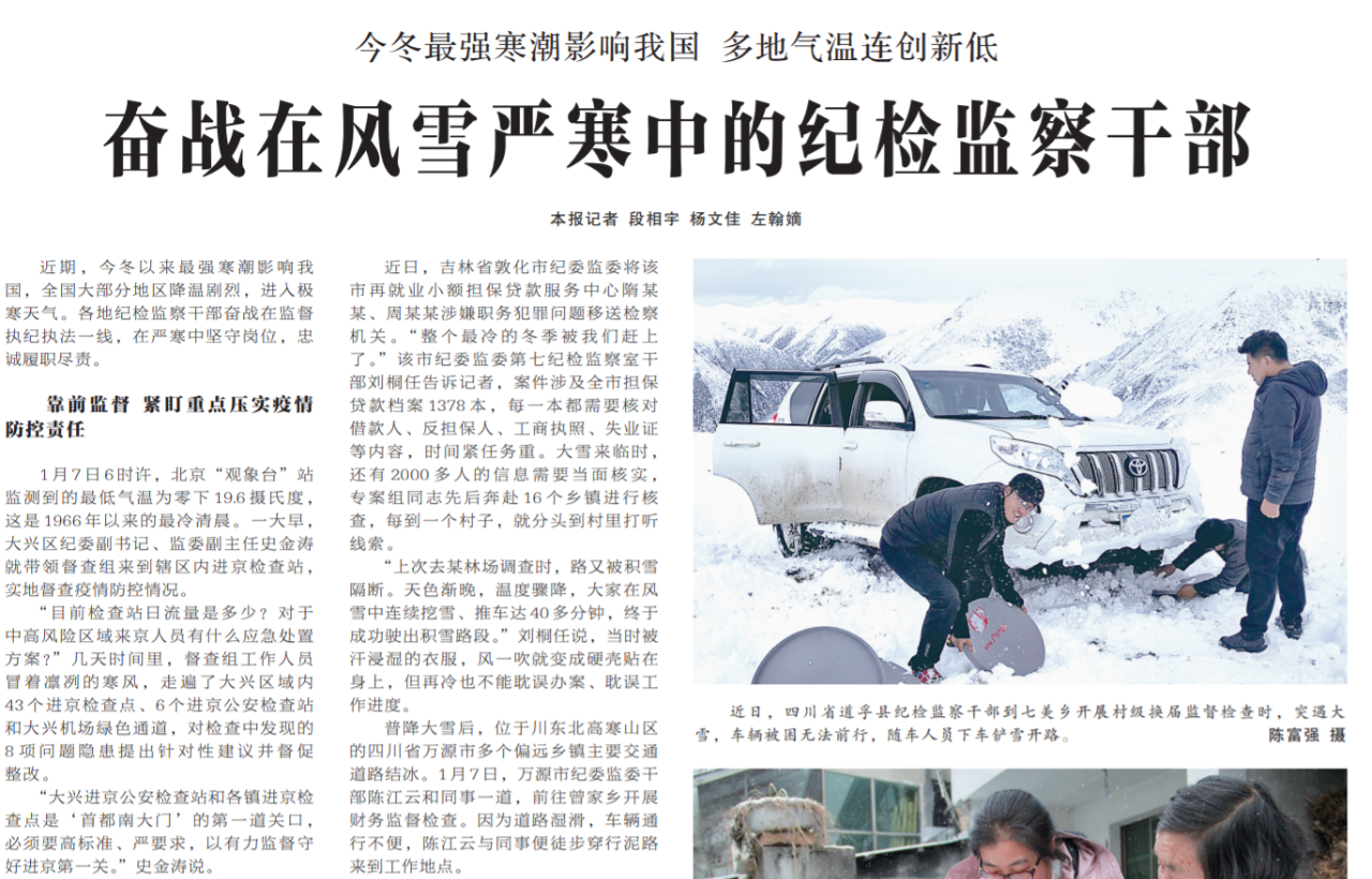 ●近期,今冬以来最强寒潮影响我国,全国大部分地区降温剧烈,进入极寒天气。今天出版的中国纪检监察报以《奋战在风雪严寒中的纪检监察干部》为题,报道了各地纪检监察干部奋战在监督执纪执法一线,在严寒中坚守岗位,忠诚履职尽责的相关情况。