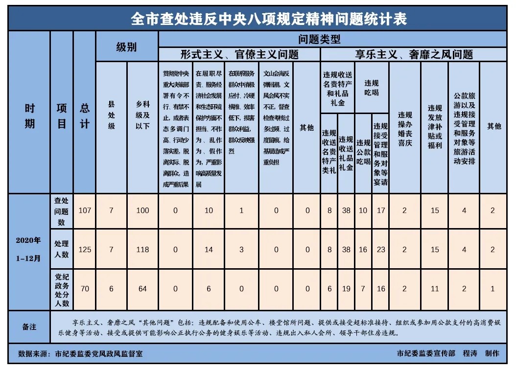 为巩固拓展落实中央八项规定精神成果,坚持不懈改进作风,铜陵市纪委监委在全市纪检监察机关建立了查处违反中央八项规定精神问题月报制度。2020年1月到12月,全市查处违反中央八项规定精神问题107起,处理125人,其中县处级7人,具体情况如下: