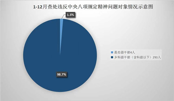2020年1-12月,全市共处理297人,给予党纪政务处分106人。其中县处级干部4人,乡科级干部(含科级以下)293人。全市各级纪检监察机关利用文件、网络等媒体通报曝光违反中央八项规定精神问题共28批次43起,涉及46人。(宣城市纪委监委)