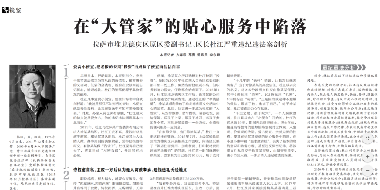 ●今天出版的中国纪检监察报以《在“大管家”的贴心服务中陷落》为题,剖析拉萨市堆龙德庆区原区委副书记、区长杜江严重违纪违法案。杜江是西藏历史上第一个“落马”的在任区长。