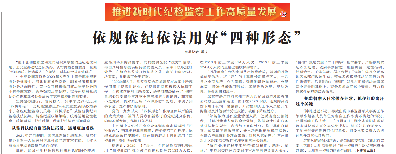 ●今天出版的中国纪检监察报头版发布推进新时代纪检监察工作高质量发展系列报道之七《依规依纪依法用好“四种形态”》。文章指出:坚持惩前毖后、治病救人,实事求是深化运用“四种形态”,是纪检监察工作高质量发展的必然要求。各级纪检监察机关将“四种形态”从监督执纪向监察执法拓展,精准把握政策策略,统筹运用党性教育、政策感召、纪法威慑,做到纪法情理贯通融合。