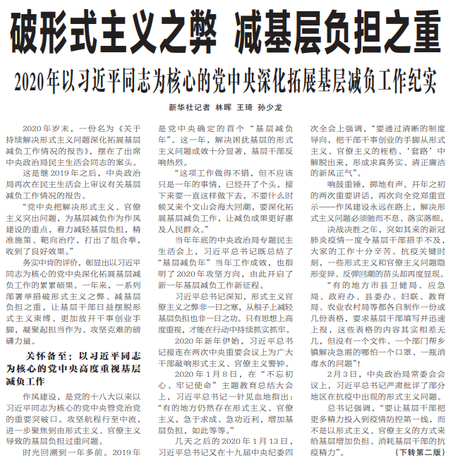 ●今天出版的中国纪检监察报头版头条刊发新华社报道《破形式主义之弊 减基层负担之重》。文章指出,一年来,一系列部署举措破形式主义之弊、减基层负担之重,让基层干部日益摆脱形式主义束缚、更加放开干事创业手脚,凝聚起担当作为、攻坚克难的磅礴力量。