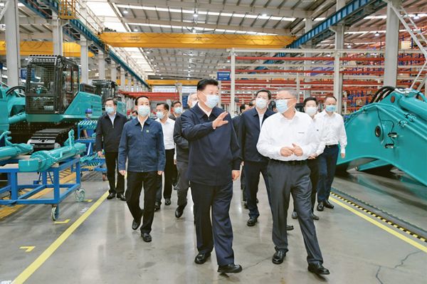 2020年9月16日至18日,中共中央总书记、国家主席、中央军委主席习近平在湖南考察。这是17日下午,习近平在长沙市山河智能装备股份有限公司生产车间,察看装备制造流程,了解技术研发、生产制造情况。 新华社记者 李学仁/摄