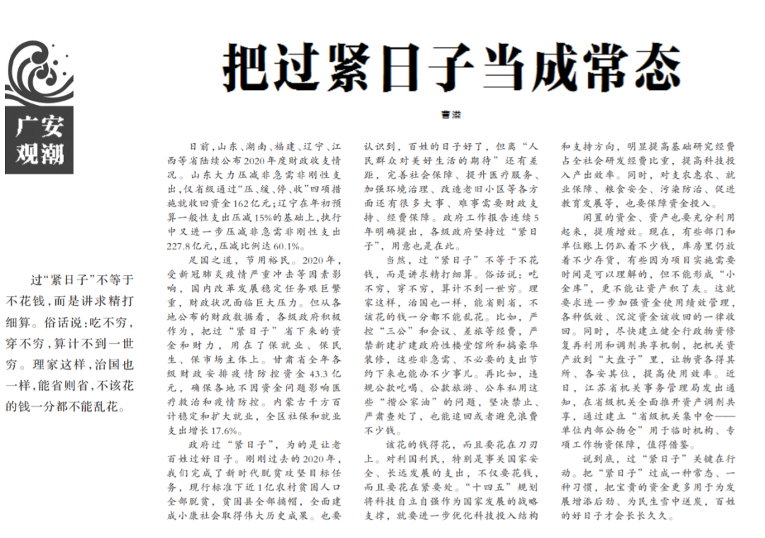 ●今天出版的中国纪检监察报广安观潮专栏发表评论《把过紧日子当成常态》。文章指出:把“紧日子”过成一种常态、一种习惯,把宝贵的资金更多用于为发展增添后劲、为民生雪中送炭,百姓的好日子才会长长久久。