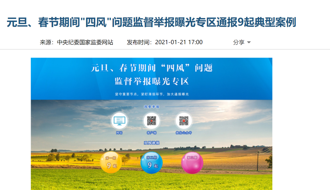 ●中央纪委国家监委网站元旦、春节期间"四风"问题监督举报曝光专区21日通报9起典型案例,包括湖南省安化县医药总公司总经理宁回军等人违规组织公款旅游问题等。