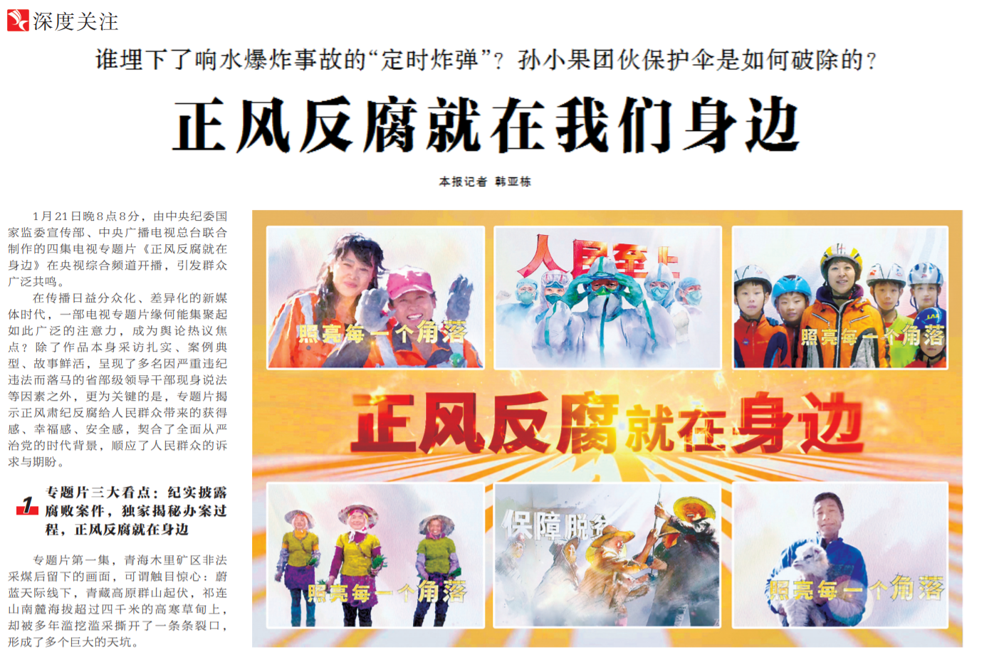 ●1月21日晚8点8分,由中央纪委国家监委宣传部、中央广播电视总台联合制作的四集电视专题片《正风反腐就在身边》在央视综合频道开播。今天出版的中国纪检监察报深度关注专栏报道指出:专题片揭示正风肃纪反腐给人民群众带来的获得感、幸福感、安全感,契合了全面从严治党的时代背景,顺应了人民群众的诉求与期盼。