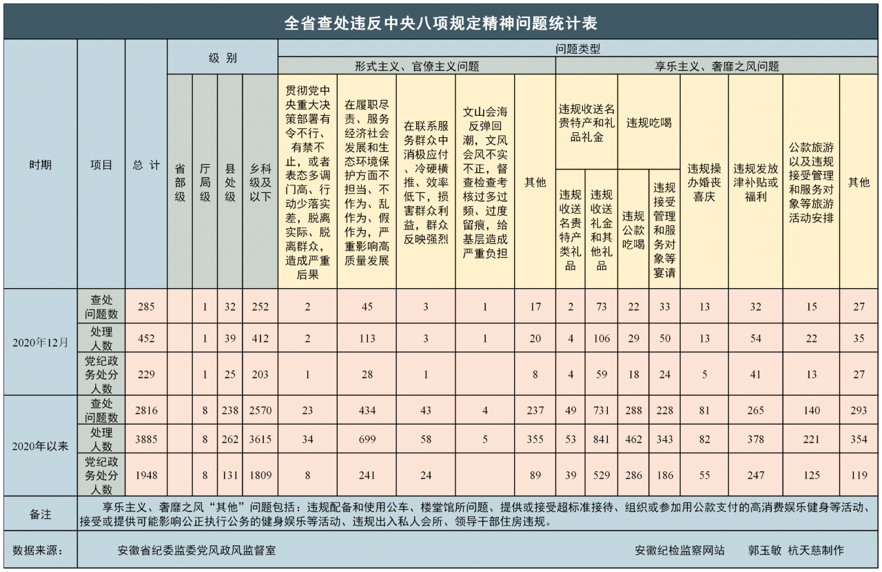 ●2020年全省纪检监察机关共查处违反中央八项规定精神问题2816起3885人,给予党纪政务处分1948人。