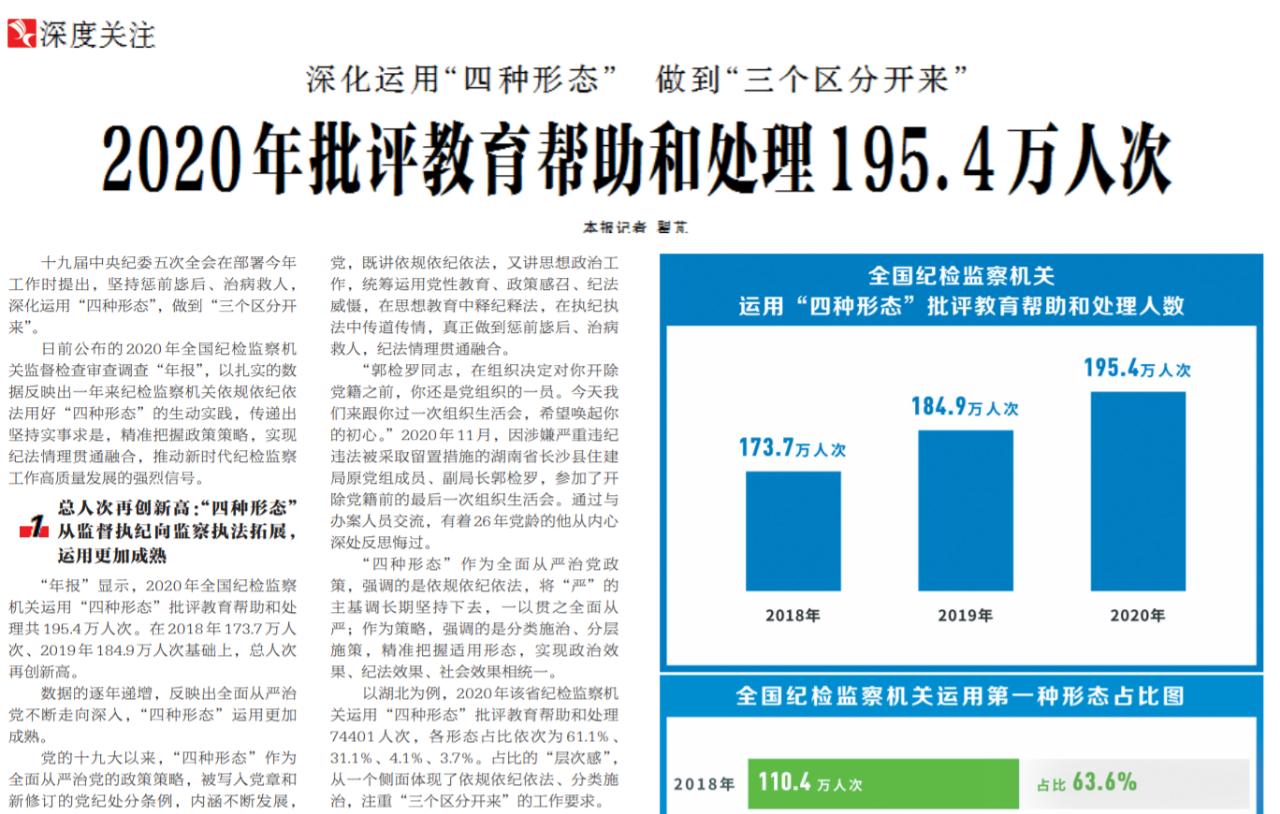 ●今天出版的中国纪检监察报深度关注专栏聚焦2020年全国纪检监察机关深化运用“四种形态”的相关情况。2020年,全国纪检监察机关运用“四种形态”批评教育帮助和处理共195.4万人次,总人次再创新高。