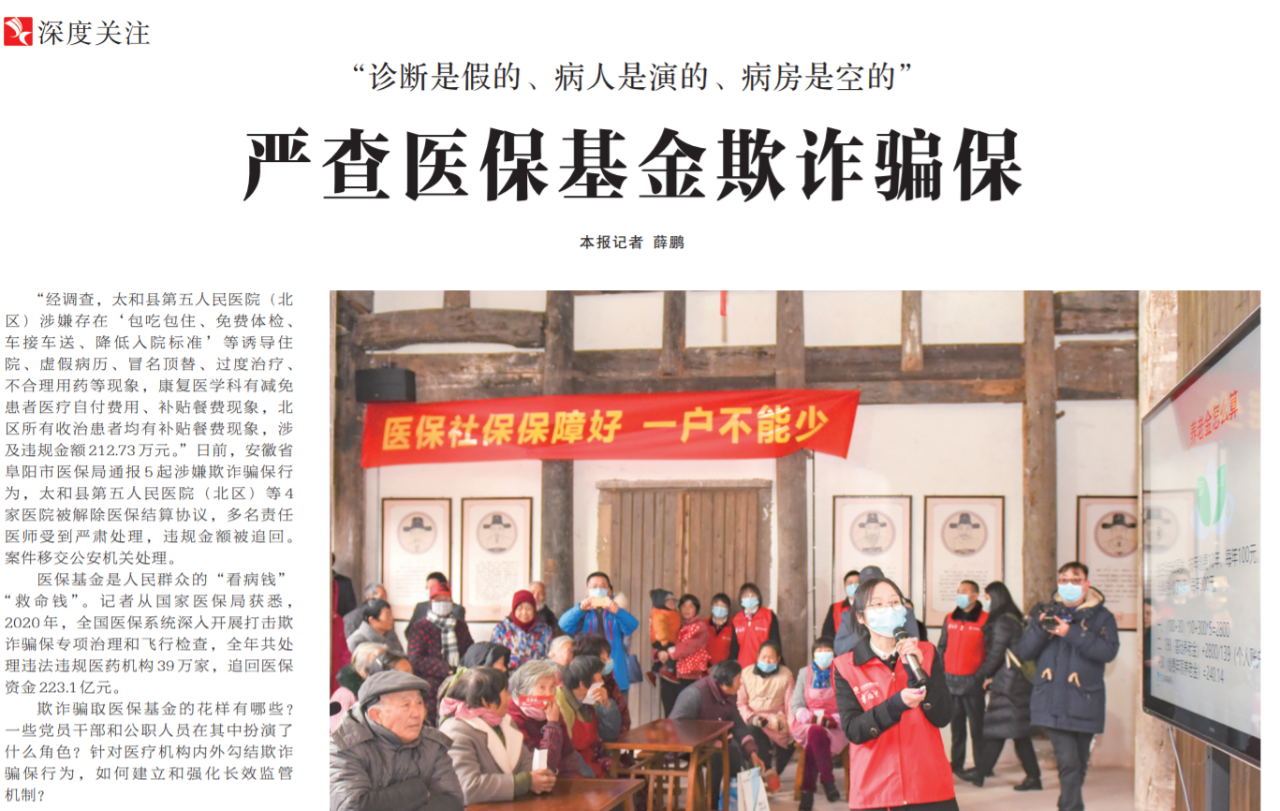 ●今天出版的中国纪检监察报深度关注专栏聚焦医保基金欺诈骗保问题。文章指出:医院骗保屡禁不止的原因是多方面的,既有监管制度体系不健全、约束机制不完善等客观因素制约,也有参保群众和医保定点医院、定点药店主观认识方面的问题。