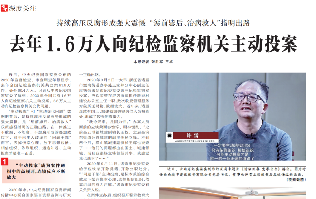 ●2020年,全国共有1.6万人向纪检监察机关主动投案,6.6万人主动向纪检监察机关交代问题。今天出版的中国纪检监察报深度关注专栏就此刊发报道指出:十九大以来,主动投案人数的显著增长,既反映了反腐败斗争一刻不停歇,也为提高处理主动投案工作的规范化法治化水平提出了新要求。