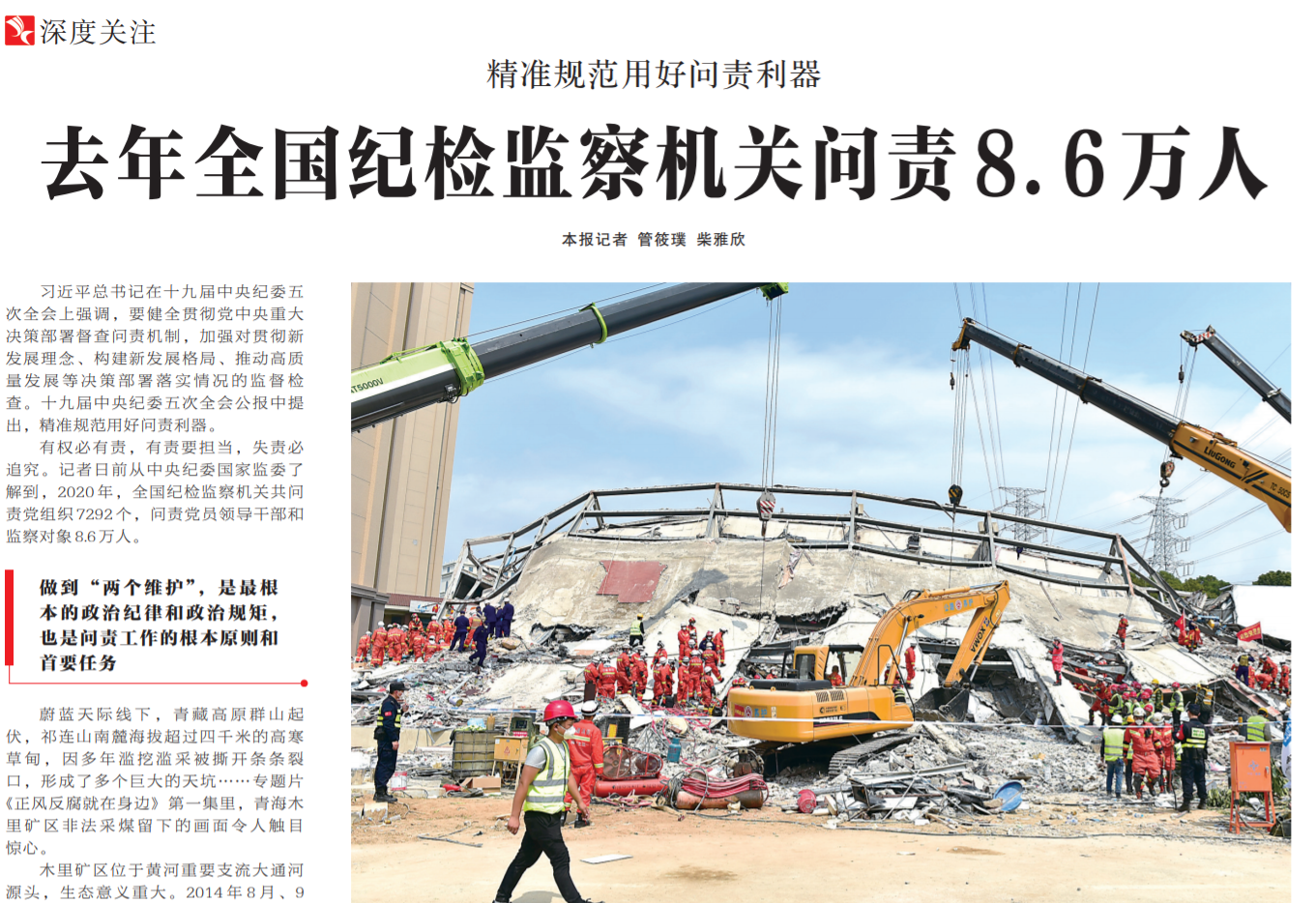 ●2020年,全国纪检监察机关共问责党组织7292个,问责党员领导干部和监察对象8.6万人。今天出版的中国纪检监察报就此报道指出:纪检监察机关既要防止问责不力,也要防止问责泛化简单化。