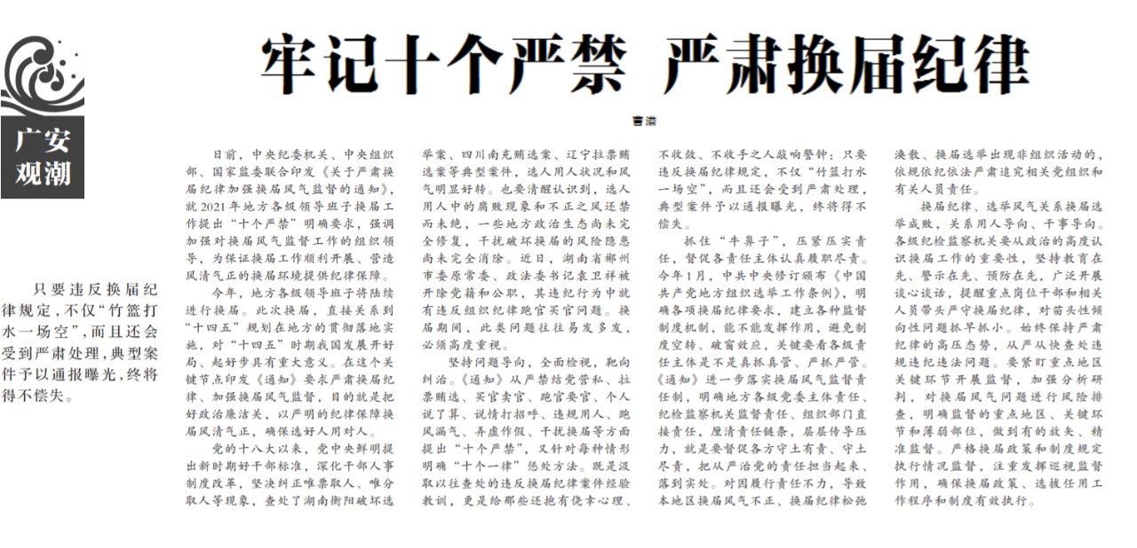 ●今天出版的中国纪检监察报广安观潮专栏发表评论《牢记十个严禁 严肃换届纪律》指出:换届纪律、选举风气关系换届选举成败,关系用人导向、干事导向。各级纪检监察机关要从政治的高度认识换届工作的重要性,始终保持严肃纪律的高压态势。