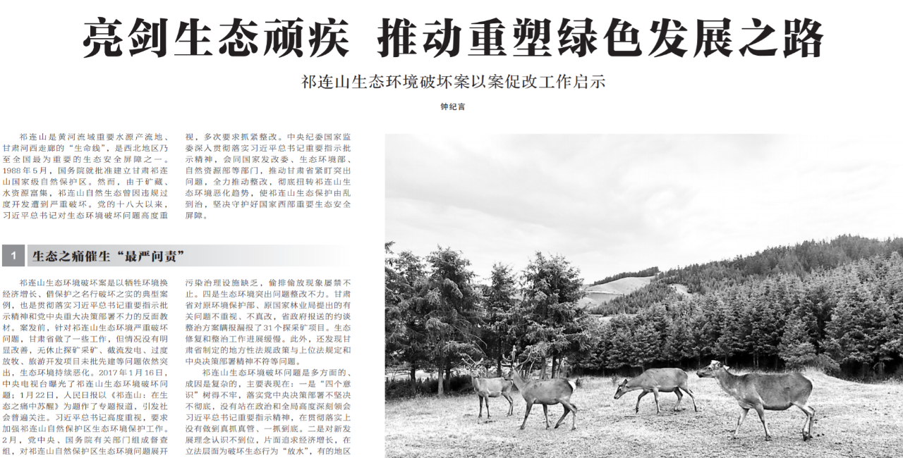 ●今天出版的中国纪检监察报以《亮剑生态顽疾 推动重塑绿色发展之路》为题,报道了祁连山生态环境破坏案以案促改工作的情况。祁连山生态环境破坏案是以牺牲环境换经济增长、借保护之名行破坏之实的典型案例,也是贯彻落实习近平总书记重要指示批示精神和党中央重大决策部署不力的反面教材。