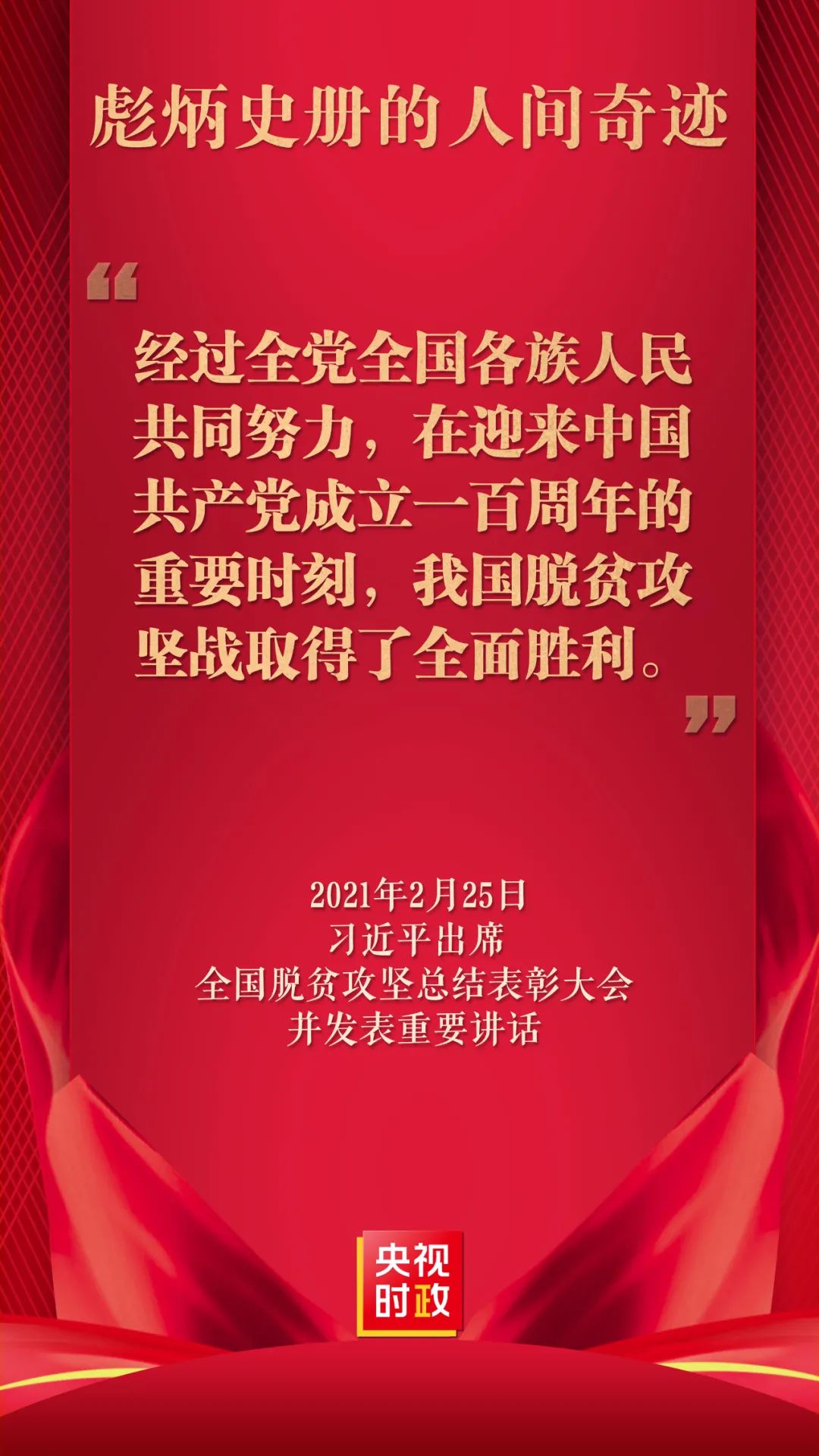 全国脱贫攻坚总结表彰大会2月25日上午在北京人民大会堂隆重举行。中共中央总书记、国家主席、中央军委主席习近平向全国脱贫攻坚楷模荣誉称号获得者颁奖并发表重要讲话。习近平庄严宣告,经过全党全国各族人民共同努力,在迎来中国共产党成立一百周年的重要时刻,我国脱贫攻坚战取得了全面胜利。