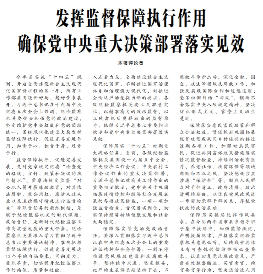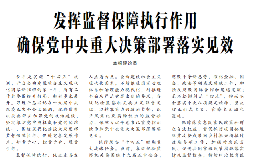 ●今天出版的中国纪检监察报发表评论员文章《发挥监督保障执行作用确保党中央重大决策部署落实见效》。文章指出:各级纪检监察机关要围绕十九届五中全会、中央经济工作会议、中央农村工作会议作出的重大决策部署,习近平总书记就有关工作作出的重要指示批示,党中央关于巩固拓展疫情防控和经济社会发展成果的各项政策措施,一项一项加强监督检查,督促落实到位。