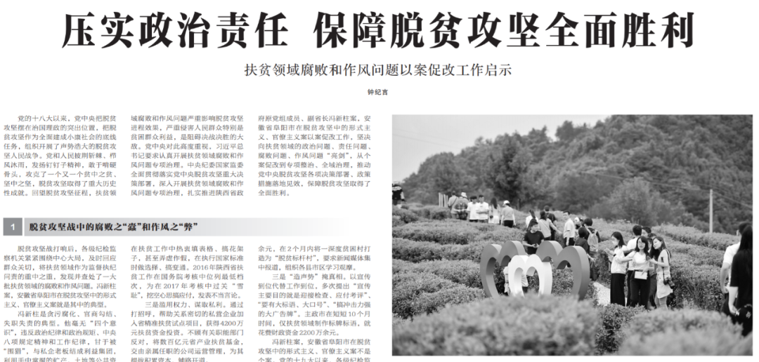 ●今天出版的中国纪检监察报以《压实政治责任 保障脱贫攻坚全面胜利》为题,报道了扶贫领域腐败和作风问题以案促改工作的开展情况。其中安徽省推进阜阳市在脱贫攻坚中的形式主义、官僚主义案以案促改工作,部署以案示警、以案为戒、以案促改“三以案”警示教育,推动“四对照、四检视、四整治”。