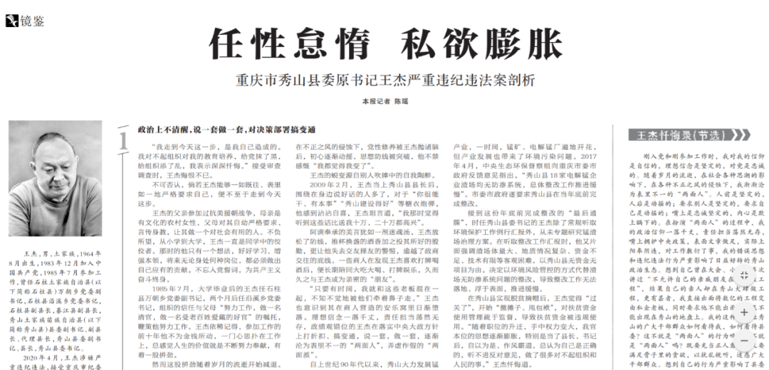 ●今天出版的中国纪检监察报以《任性怠惰 私欲膨胀》为题,剖析重庆市秀山县委原书记王杰严重违纪违法案。王杰专权擅势,在扭曲的权力观里迷失堕落,终于从县委书记沦为阶下囚。