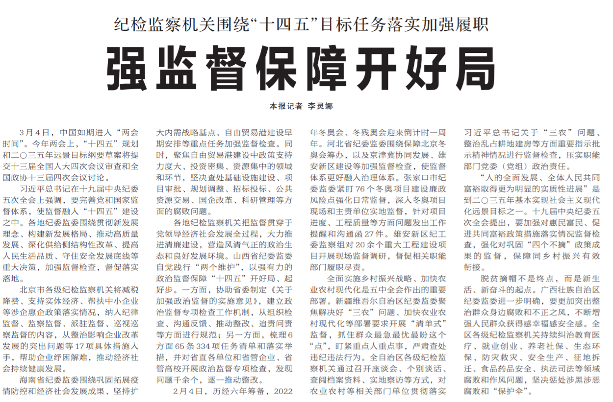 ●今天出版的中国纪检监察报头版头条以《强监督保障开好局》为题,报道了纪检监察机关围绕“十四五”目标任务落实加强履职的相关举措,包括开展政治监督专项检查等。