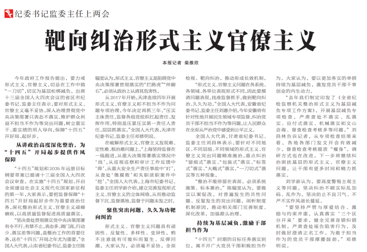 ●今天出版的中国纪检监察报“纪委书记监委主任上两会”专栏,就如何靶向纠治形式主义官僚主义采访了部分出席十三届全国人大四次会议的省区市纪委书记、监委主任。其中全国人大代表,安徽省纪委书记、监委主任刘惠介绍,今年安徽将有针对性地开展民生领域专项监督,纠治党员干部不担当不作为等问题,让人民群众在全面从严治党中感受到公平正义。
