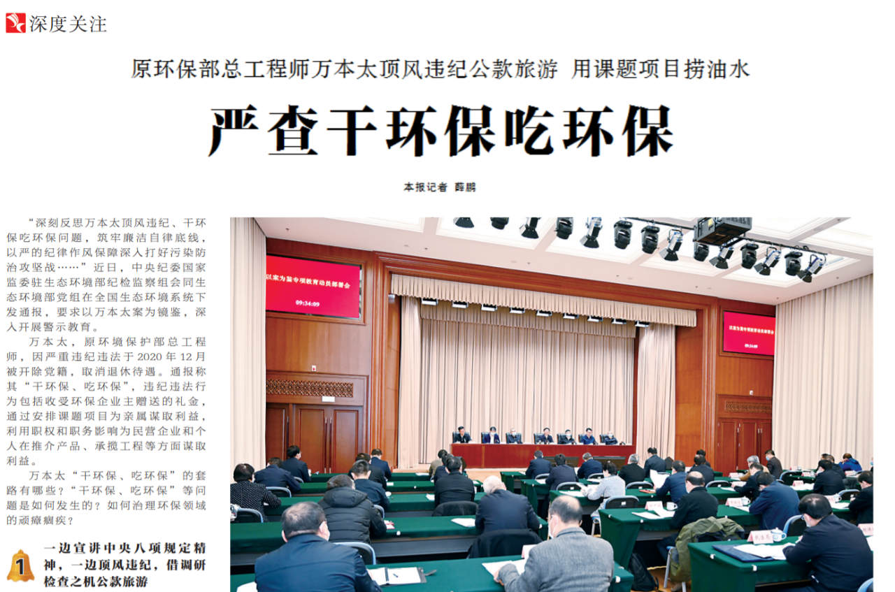 ●近日,中央纪委国家监委驻生态环境部纪检监察组会同生态环境部党组在全国生态环境系统下发通报,要求以原环保部总工程师万本太案为镜鉴,深入开展警示教育,严查干环保吃环保。今天出版的中国纪检监察报深度关注专栏对此进行了报道。