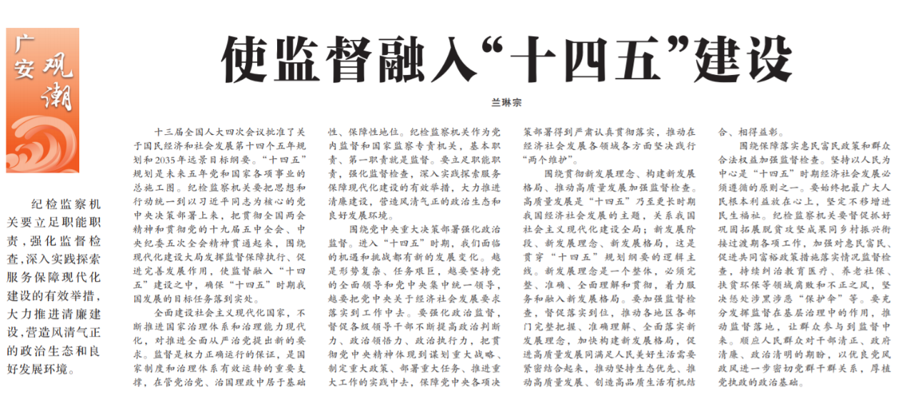 ●今天出版的中国纪检监察报广安观潮专栏发表评论《使监督融入“十四五”建设》。文章指出:纪检监察机关要强化监督检查,深入实践探索服务保障现代化建设的有效举措,大力推进清廉建设,营造风清气正的政治生态和良好发展环境。