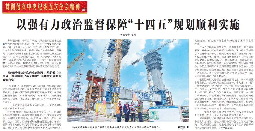 ●今天出版的中国纪检监察报头版头条刊发“贯彻落实中央纪委五次全会精神”系列报道之三《以强有力政治监督保障“十四五”规划顺利实施》。