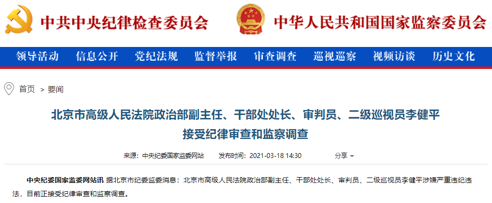 ●据中纪委网站消息,北京市高级人民法院政治部副主任、干部处处长、审判员、二级巡视员李健平涉嫌严重违纪违法,目前正接受纪律审查和监察调查。