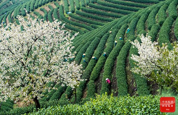 杭州龙井茶进入采摘期,层层叠叠的茶园里,茶农们忙着采摘茶叶。(杭州市淳安县纪委监委供 钱德星 摄)