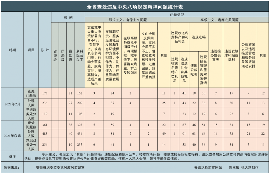 ●2021年2月,安徽省纪检监察机关共查处违反中央八项规定精神问题173起,批评教育帮助和处理236人,给予党纪政务处分119人。