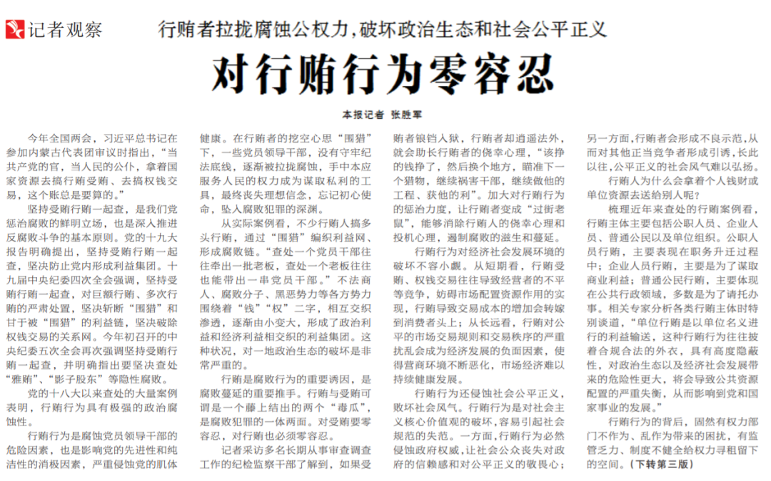 ●今天出版的中国纪检监察报头版以《对行贿行为零容忍》为题报道指出:坚持受贿行贿一起查,是我们党惩治腐败的鲜明立场,也是深入推进反腐败斗争的基本原则。对受贿要零容忍,对行贿也必须零容忍。