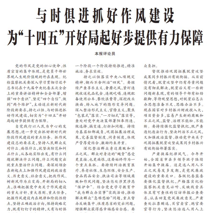 ●今天出版的中国纪检监察报发表评论员文章《与时俱进抓好作风建设 为“十四五”开好局起好步提供有力保障》。文章指出:纪检监察机关要主动适应新时代新阶段新要求,持之以恒、与时俱进抓好作风建设,切实为“十四五”开好局起好步提供有力保障。