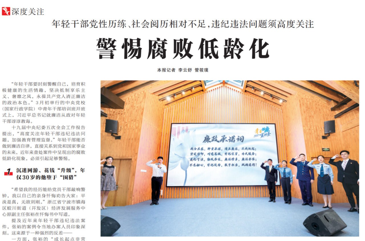 ●今天出版的中国纪检监察报深度关注专栏以《警惕腐败低龄化》为题报道指出:近年来查处案件中呈现出的腐败低龄化现象,必须引起足够警惕。对年轻干部要高标准、严要求,着眼早、立足小,完善监督机制,健全监管制度,增强对年轻干部权力监督的规范性。