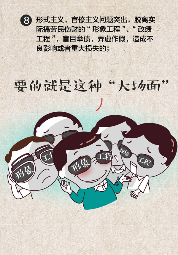 (八)形式主义、官僚主义问题突出,脱离实际搞劳民伤财的“形象工程”、“政绩工程”,盲目举债,弄虚作假,造成不良影响或者重大损失的;