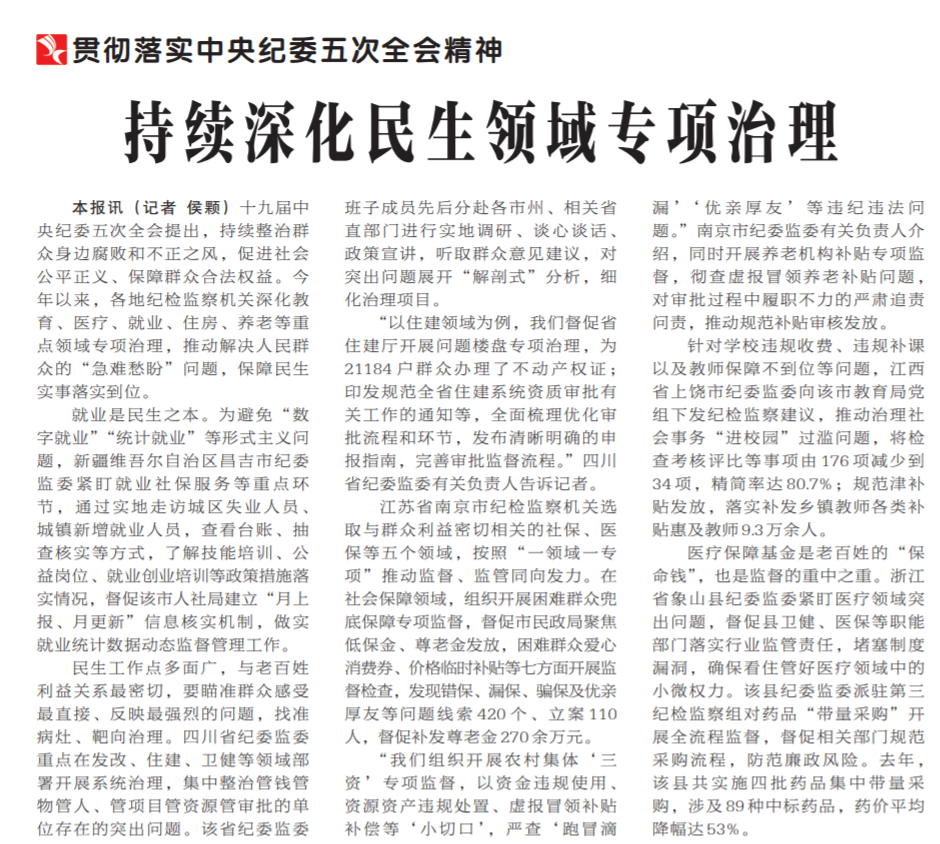 ●今天出版的中国纪检监察报头版报道了各地纪检监察机关深化教育、医疗等重点领域专项治理,推动解决人民群众的“急难愁盼”问题,保障民生实事落实到位的相关举措。