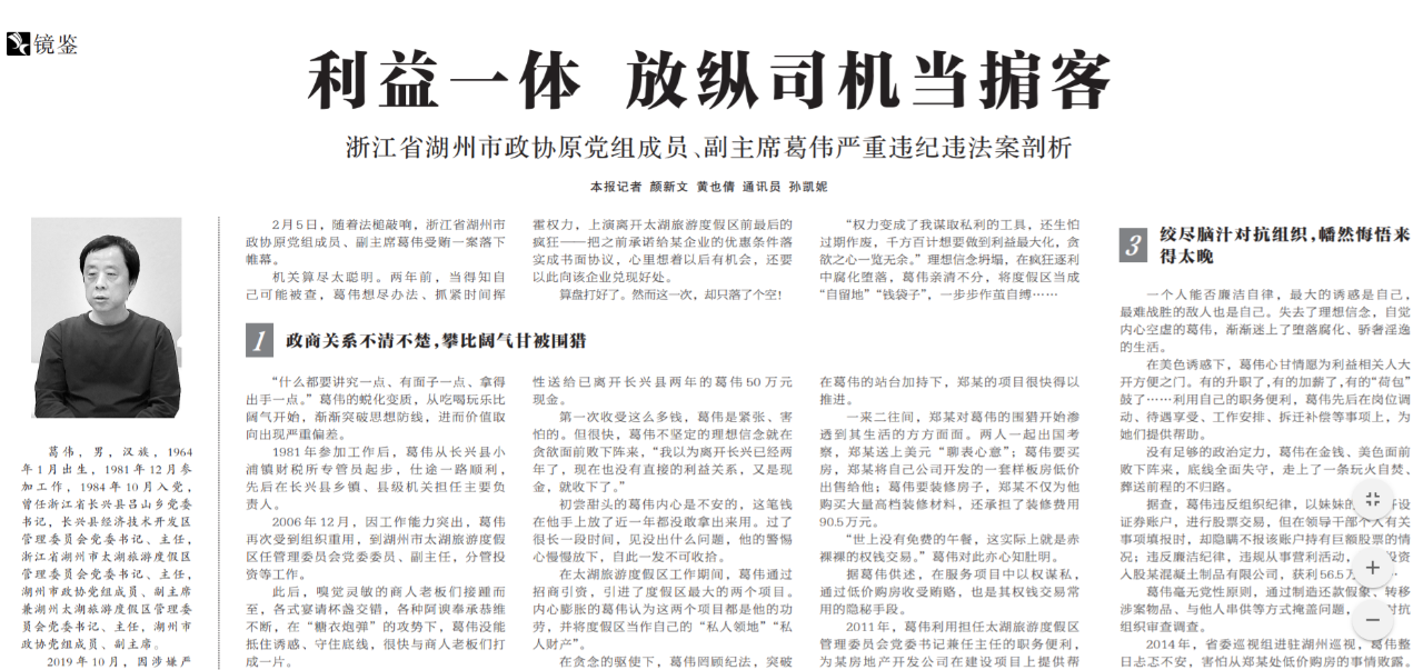 ●今天出版的中国纪检监察报以《利益一体 放纵司机当掮客》为题,深度剖析浙江省湖州市政协原副主席葛伟严重违纪违法案。