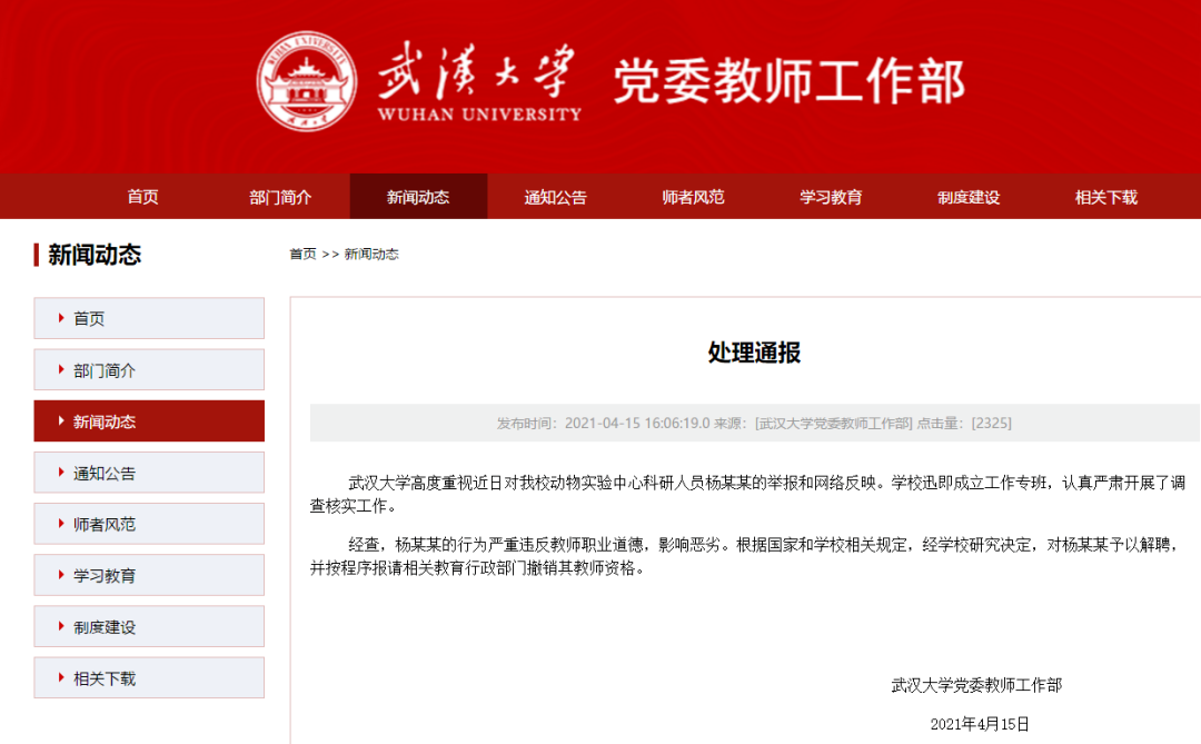 ●15日,武汉大学发布关于“科研人员杨某某涉言语骚扰女学生”的处理通报:对其予以解聘,并按程序报请相关教育行政部门撤销其教师资格。